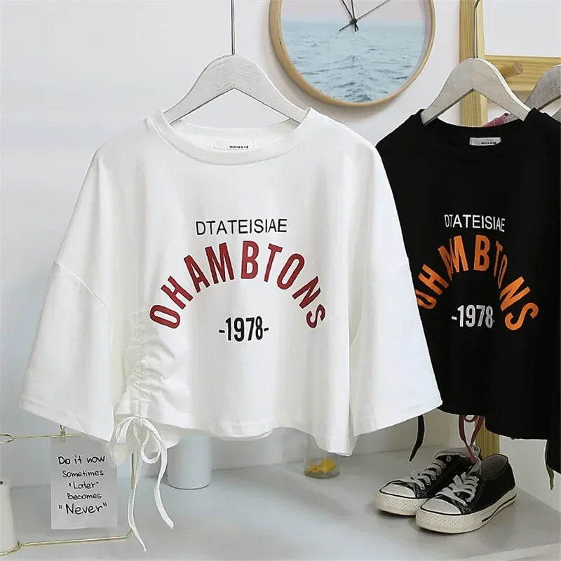 Fashionable Printed Drawstring Short Sleeve Crop Top – Women's Casual Summer T-Shirt