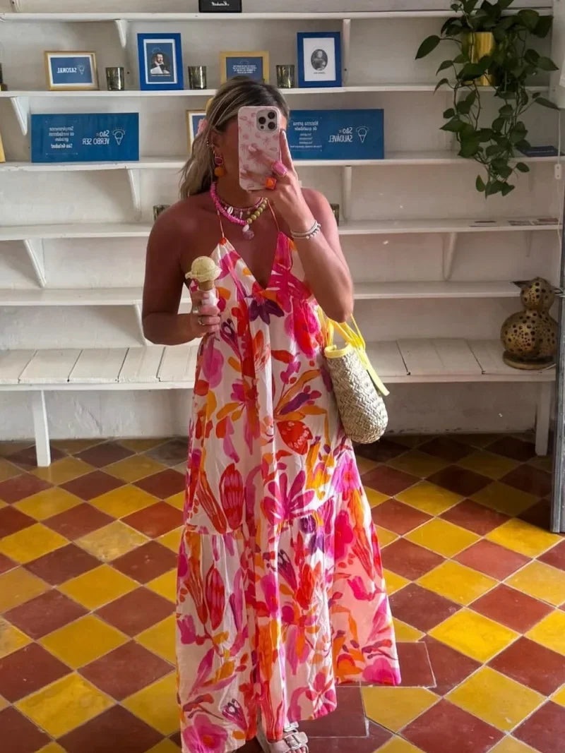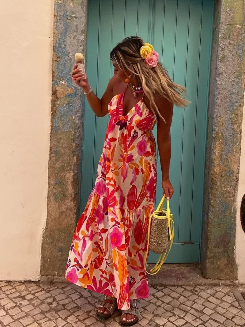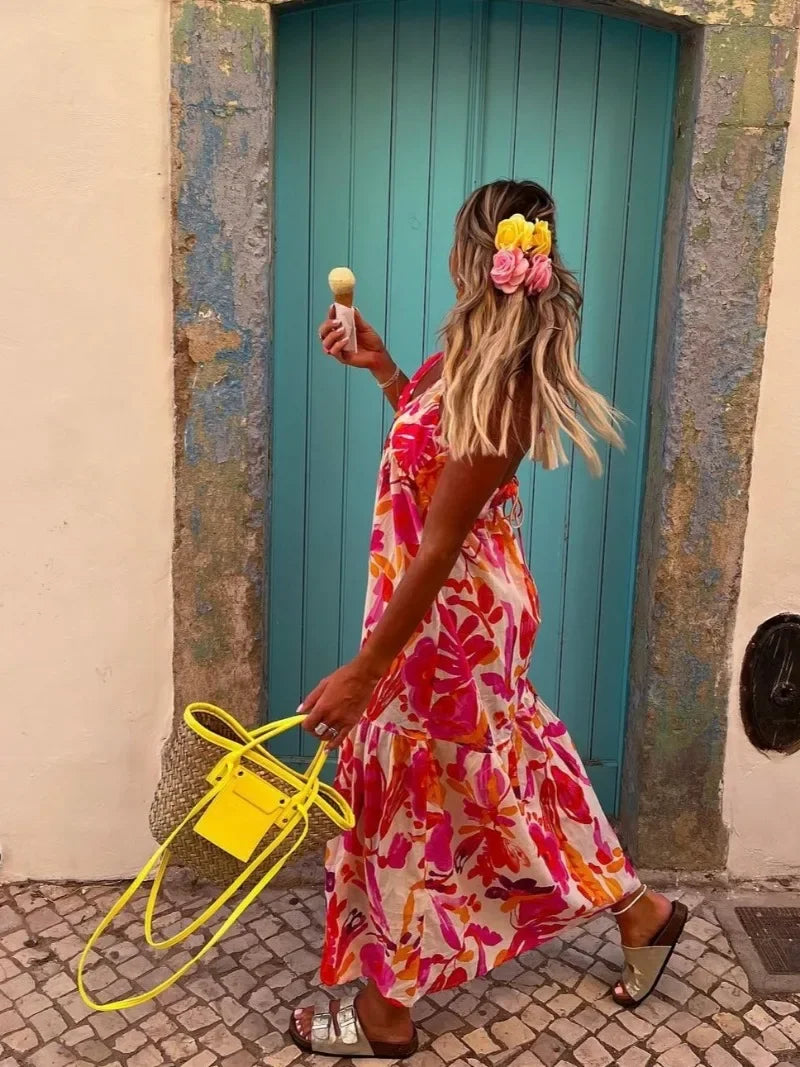 Holiday Vintage Beach Dress – Printed Tie-Up Waist Slim Dress for Women, Backless Sleeveless Summer Fashion