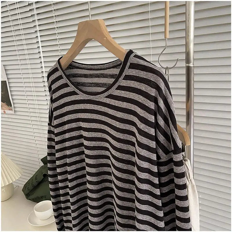 Korean Striped Loose Fit Long Sleeve T-Shirt for Women – Casual Spring/Autumn Top