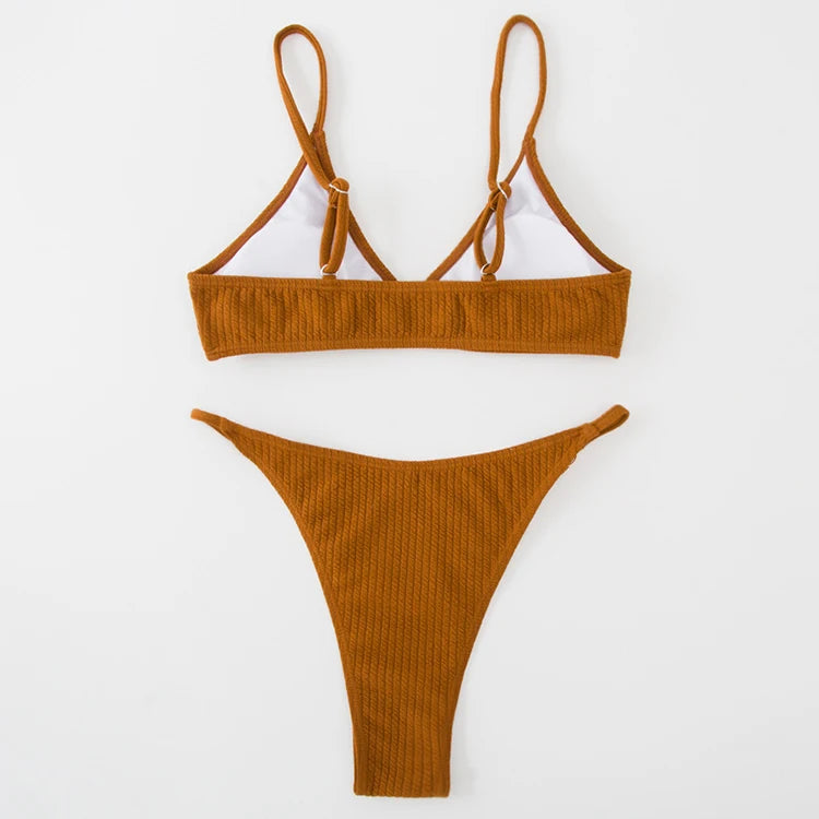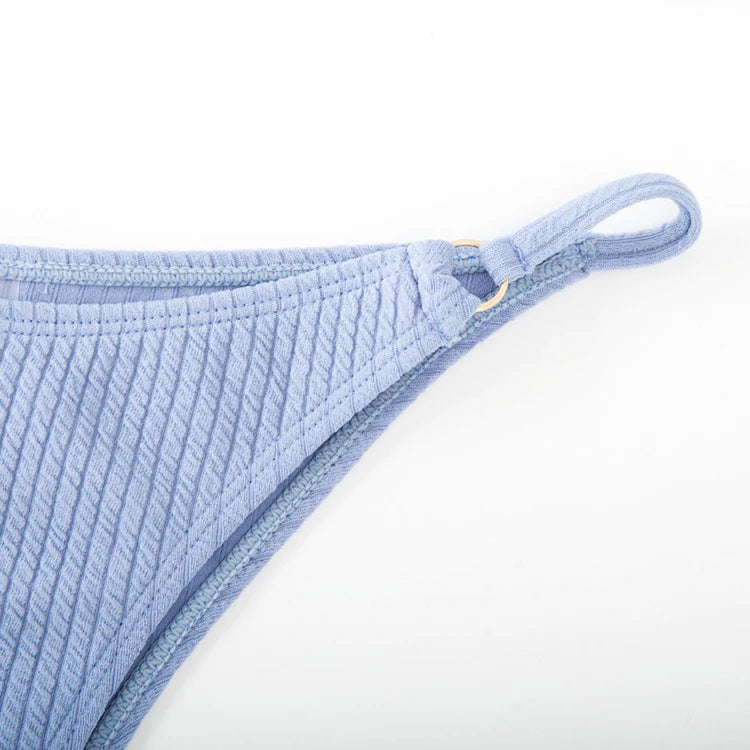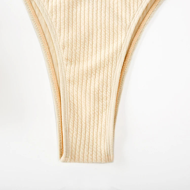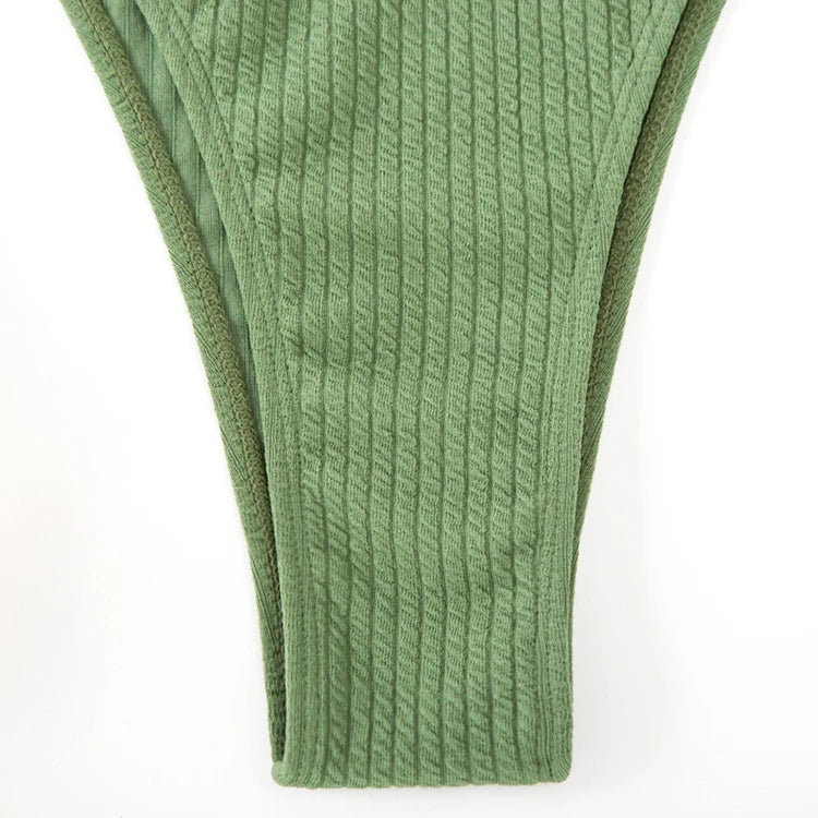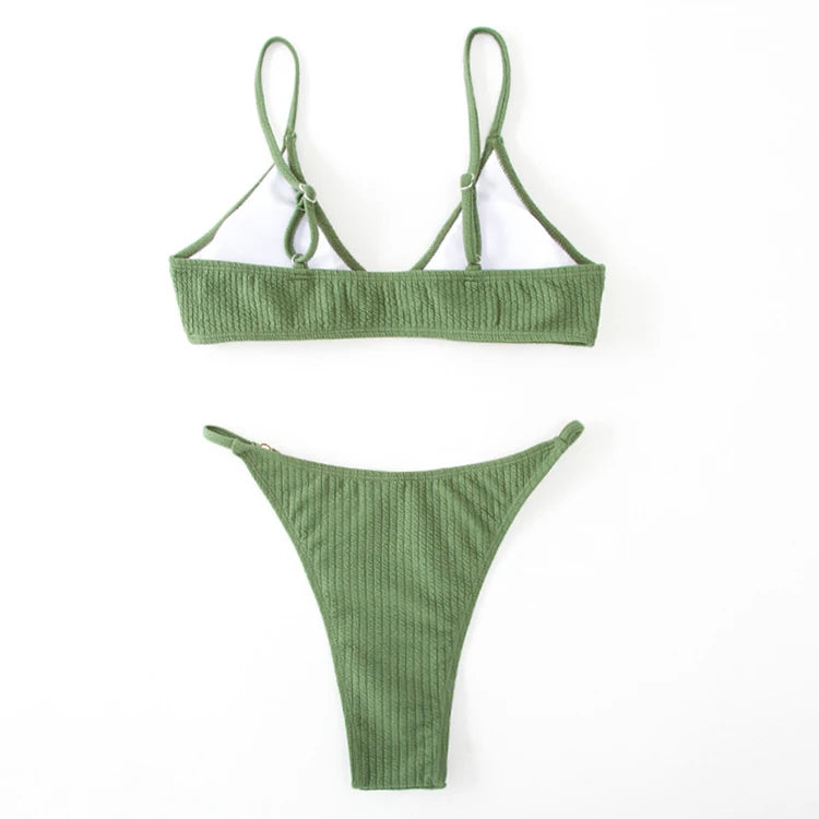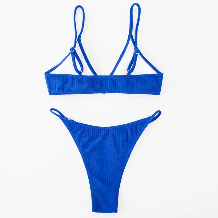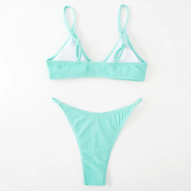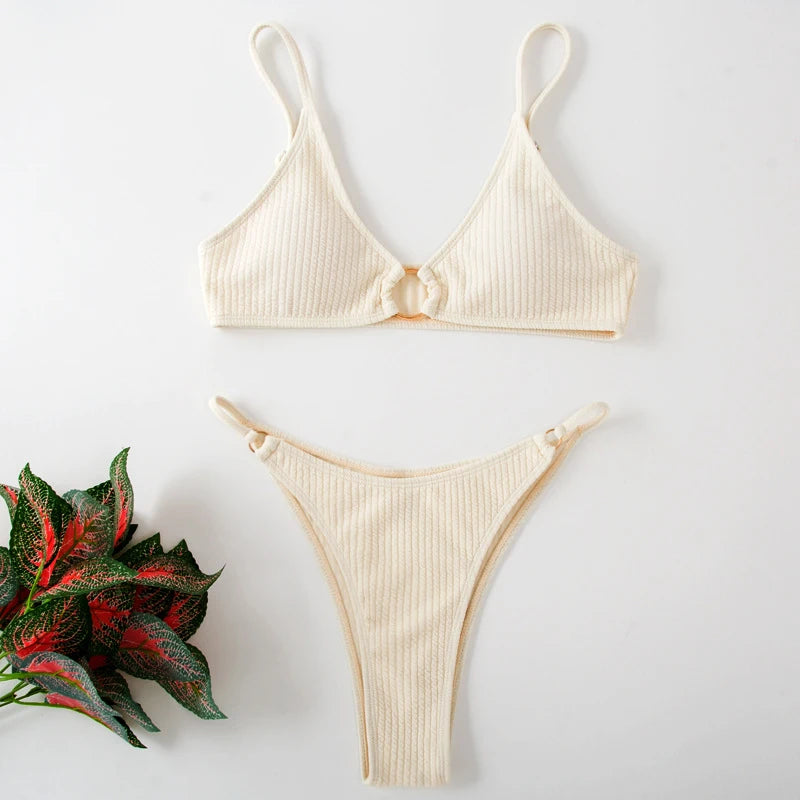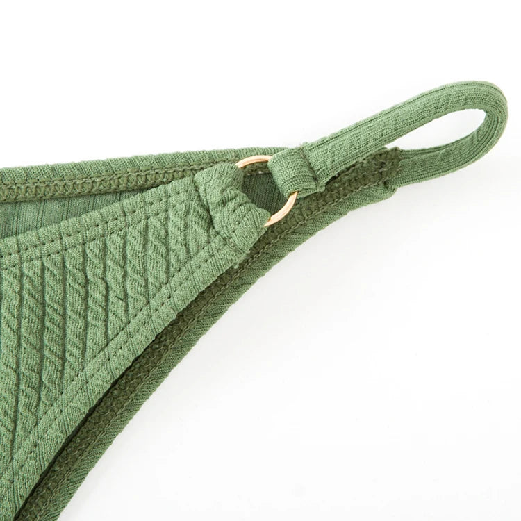 Step into summer with this effortlessly chic and daring thong swimsuit set. Designed for confident, trend-forward women, this two-piece features a padded wire-free bra and high-waisted thong bottoms. Crafted from a breathable, stretchy knit for all-day comfort and a sleek silhouette, it offers a flattering fit that enhances natural curves.