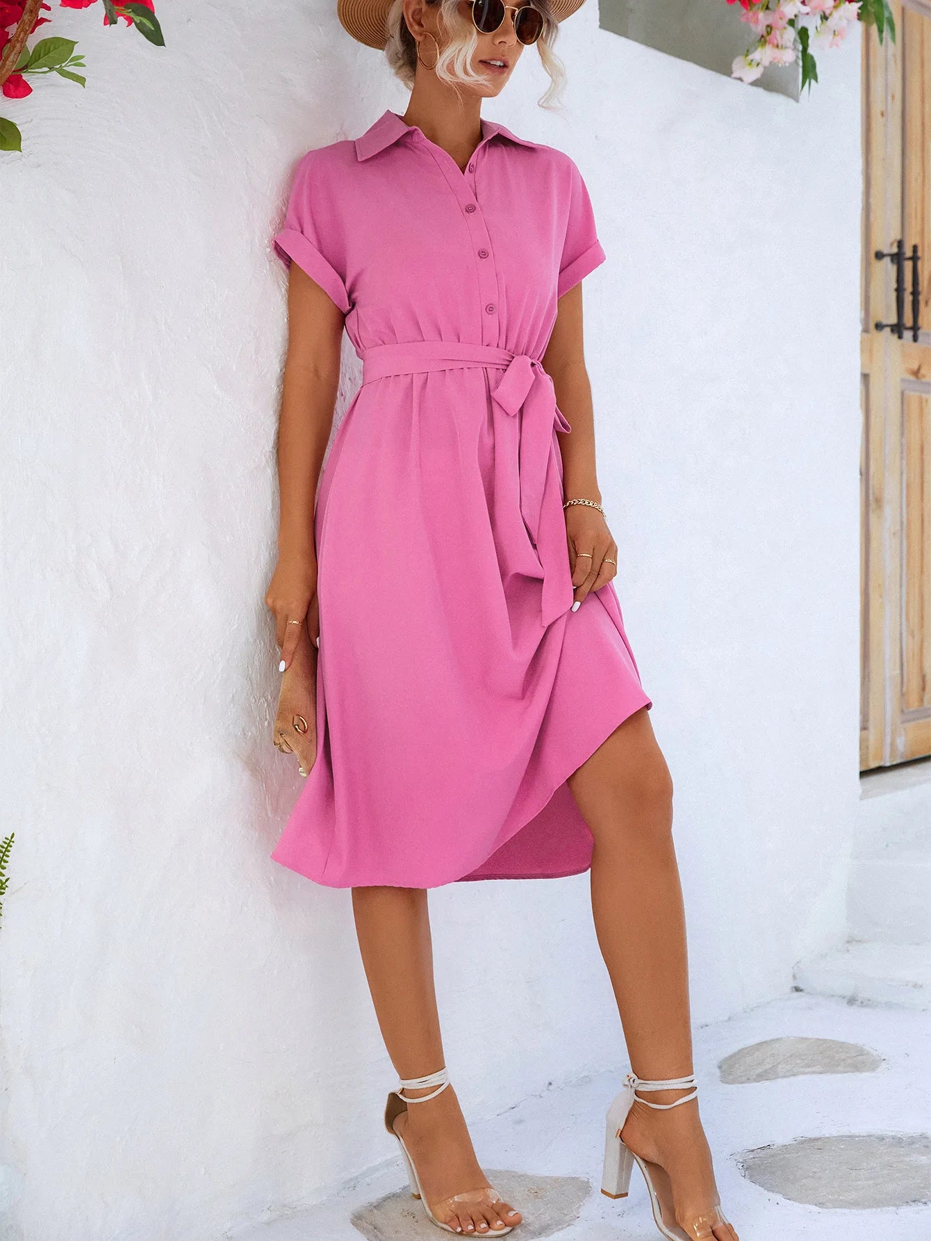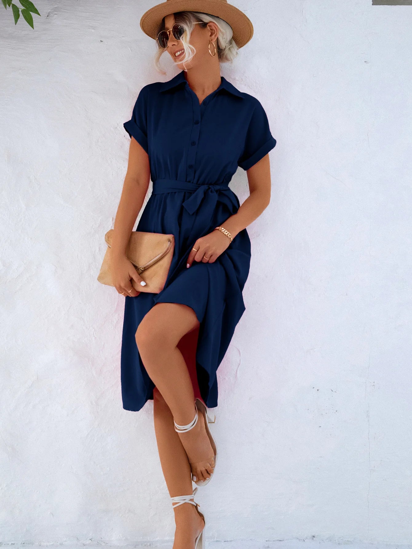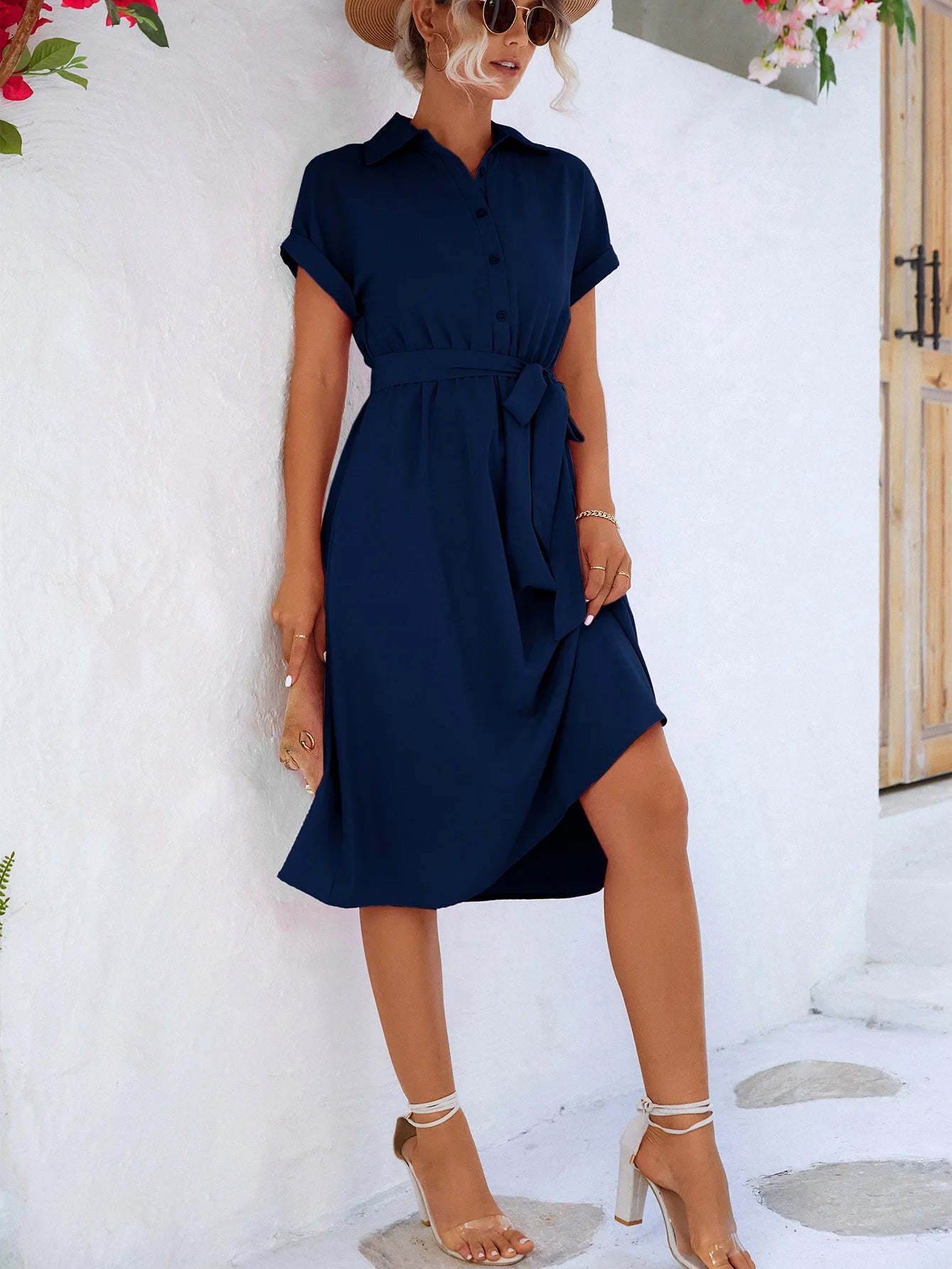 Step out in style with this lightweight and breezy long shirt dress – the perfect blend of casual and chic. Featuring a flattering waist tie and graceful mid-calf hem, it moves beautifully with you from street strolls to brunches. Made from breathable polyester, it's the ideal pick for summer days when you want to feel stylish and free.