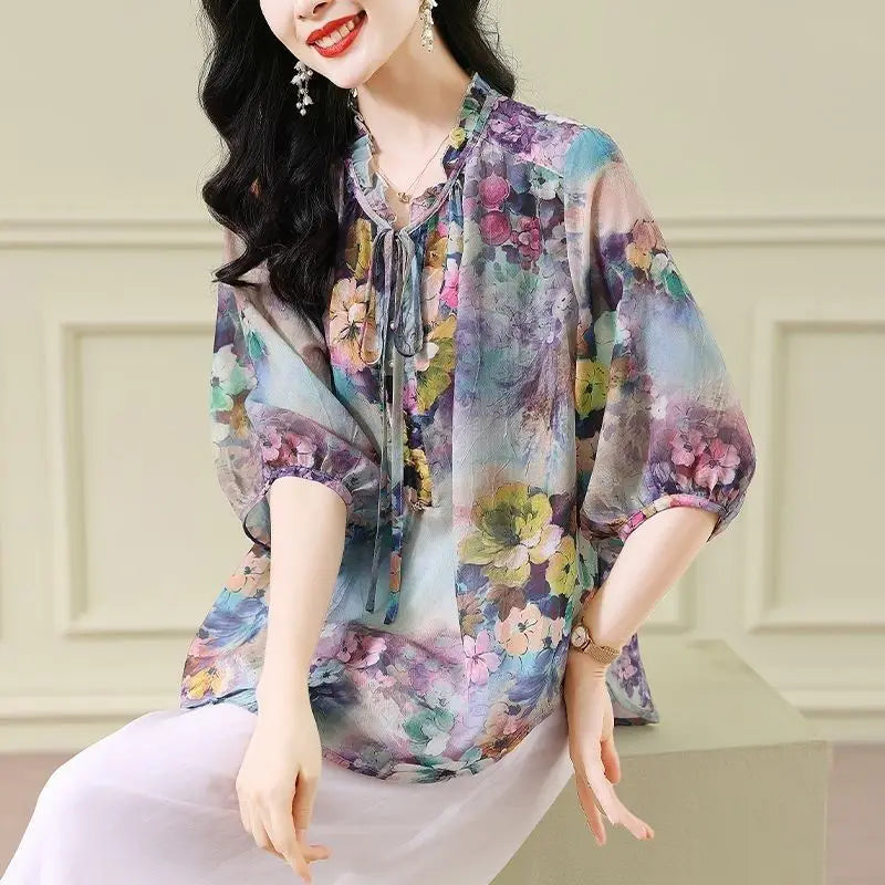 Elevate your summer wardrobe with this vintage-inspired chiffon blouse. Designed for effortless elegance, it features a loose fit, soft flowing silhouette, and artistic floral prints — perfect for both casual and semi-formal occasions.