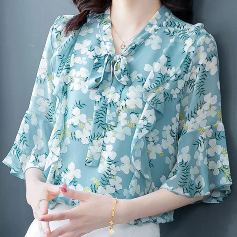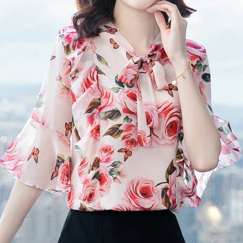 Elevate your summer wardrobe with this charming floral V-neck blouse. Designed with a loose fit and airy three-quarter sleeves, it’s perfect for warm days while keeping you effortlessly chic. The bow tie and soft floral patterns add a feminine touch, while the breathable fabric ensures comfort throughout the day.